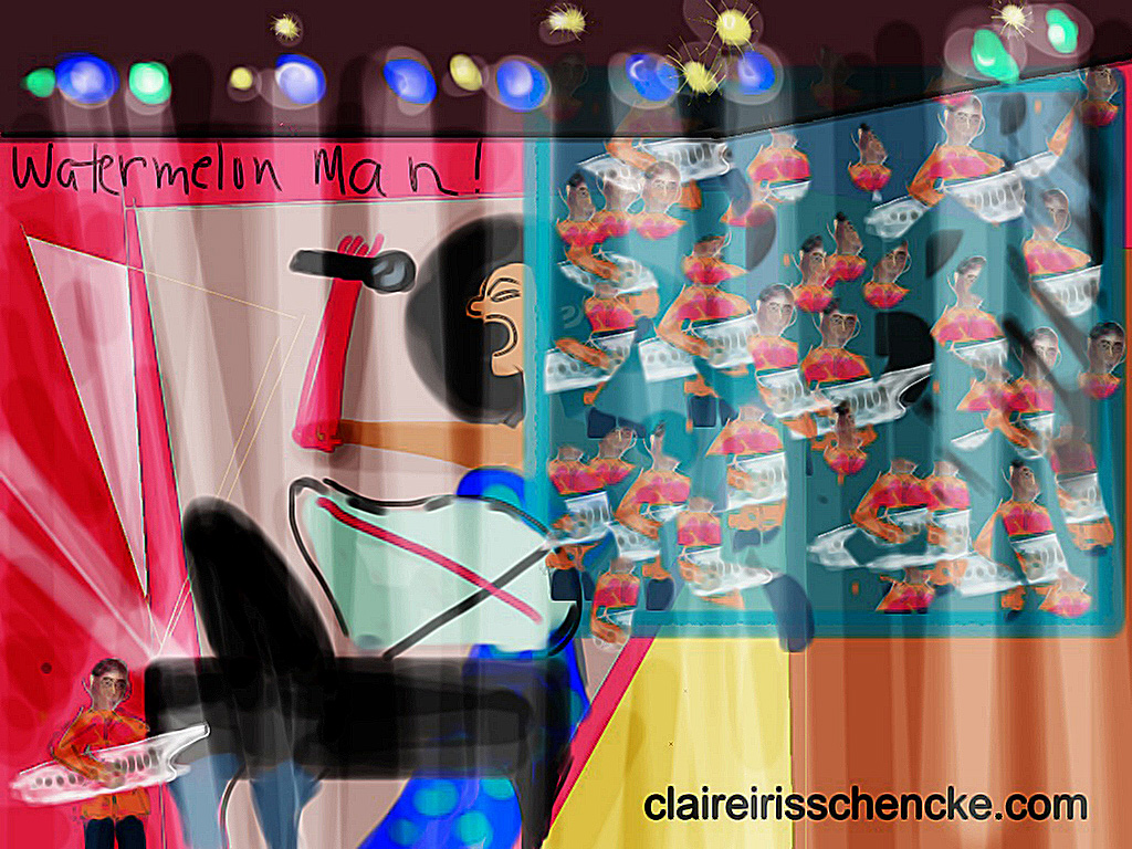 By the time Sunday came along I felt confident that I could paint on my iPad all over the sprawling Monterey Fairgrounds. After another indian meal, this time with a hot chai, I parked myself in the shade on the left hand side in the very front of the Garden Stage. Shade is needed for the iPad. The luminous touch screen is highly reflective. Tia Fuller was a very nice surprise. She was so happy to be there, and I was so happy to paint her pretty figure.